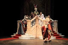 Una simple escalinata doble en el centro, al fondo, con unos tapices colgando de varas, dejan el escenario diáfano para que los intérpretes se muevan con pulcritud. Eso sí, tiene aspecto de haber costado an egg.