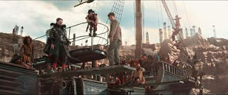Para aquellos que disfrutan simplemente de la parafernalia visual, los alardes, la magnificencia del cómic gráfico que ahora se halla en movimiento gracias a los efectos digitales, para aquellos que les basta esto y que no consideran que una narración es lo más importante, dicha parafernalia es un buen sustituto de una buena historia. Según esto, Pan es una película buena y entretenida porque verán barcos surcando el cielo, batallas contra aviones o barcos, burbujas gigantescas con peces dentro, sirenas digitales, mundos grandiosos, minas espectaculares del tamaño del Cañón del Colorado por donde se mueven como hormigas millones de niños esclavizados extrayendo materiales preciados y además ¡¡ha venido, señoras y señores, el Circo del Sol!! Sí, porque una serie de actores extraídos directamente del teatro de cabaret o de el figurinismo circense salen a cubierta pegando brincos en un alarde de enanos, feos, contrahechos, deformes y demás figuras ridículas. Los personajes se llevan al extremo de la farsa de café teatro y se convierten en gimnastas imposibles, realizan coreografías más que movimientos, componen figuras contrapuestas, atractivas y subyugantes. ¡¡Estamos, ladies and gentelmen, ante un carnaval de disfraces dignos del mejor teatro de Broadway!! ¡¡Los piratas son de diseño!! ¡¡el vestuario, el atrezzo, las joyas, los collares, las plumas, los sombreros, las casacas con faldones, los bombachos, nos deslumbran y nos alucinan!! De igual modo, el detalle con el que se ha cuidado cada elemento del barco, de fabricación digital, es prodigioso. Una técnica muy depurada, un ingenio desbordante, un resultado profesional y casi perfecto. Acompaña a este resultado